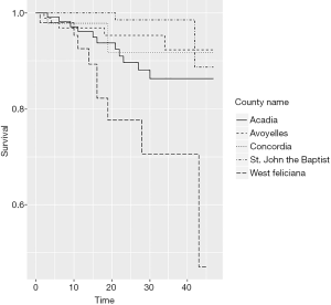 Counties with higher risk are mostly in the south-central part of the state. Figure 3 displays the spatially adjusted survival function, showing survival in all counties was higher than 90% after 40 months.