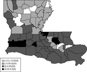 For our application we consider the prostate cancer registry data from the SEER Louisiana registry for the years 2007 through 2010, which was used previously for the development of spatially explicit survival models (35,36). The data consists of 13,835 subjects, aggregated into 64 parishes in Louisiana. We selected only observations with complete dates available and excluded 437 subjects with survival time zero, considered unknown. For the analysis, we included 11,943 subjects with non missing covariates. The time to event outcome was the time to death from any causes as the prostate only cancer deaths were too infrequent (38). The follow-up cutoff date was December 31st, 2010. Any patient that died after the follow-up cut-off date was recoded to alive as of the cut-off date. A person alive at study termination or lost to follow-up at any time during the study was considered censored (42).